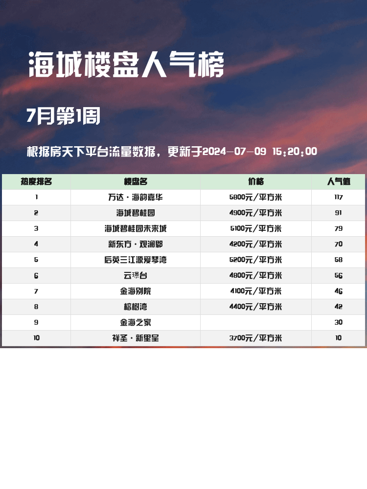 🏡购房的朋友们看过来!人气楼盘榜单不仅能帮你更好地了解市场动向,还能让你快速找到心仪的家。无论是交通便利、价格实惠还是配套设施齐全,这些楼盘都有各自的独特优势。接下来,让我们看看海城最受欢迎的前3名楼盘有哪些吧!