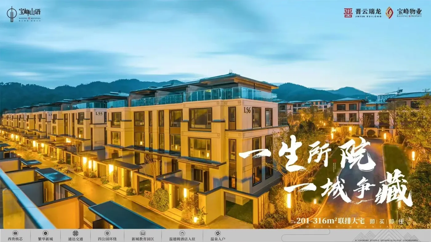 宝峰山语建筑则传承了建筑文化特色,用符合现代人审美的设计手法打造精简、雅致的现代中式建筑风格。采用一门一廊,一庭一院的空间结构。打造中国人骨子里渴望的院落生活。 中式建筑与苏式园林相得益彰,建筑仿佛生长于园林中。人与建筑、人与自然、建筑与自然互相形成美好的呼应关系。隐山水,藏天地,依水居,观院子,经年四季、十二时辰,让每一个居于此的人,感知园林与空间的美好,感知细微中透露的生活美学。宝峰山语,得静谧于园中,拒喧嚣于世外。