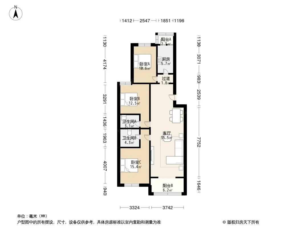 户型是3室2厅0厨0卫1阳台,南北朝向
