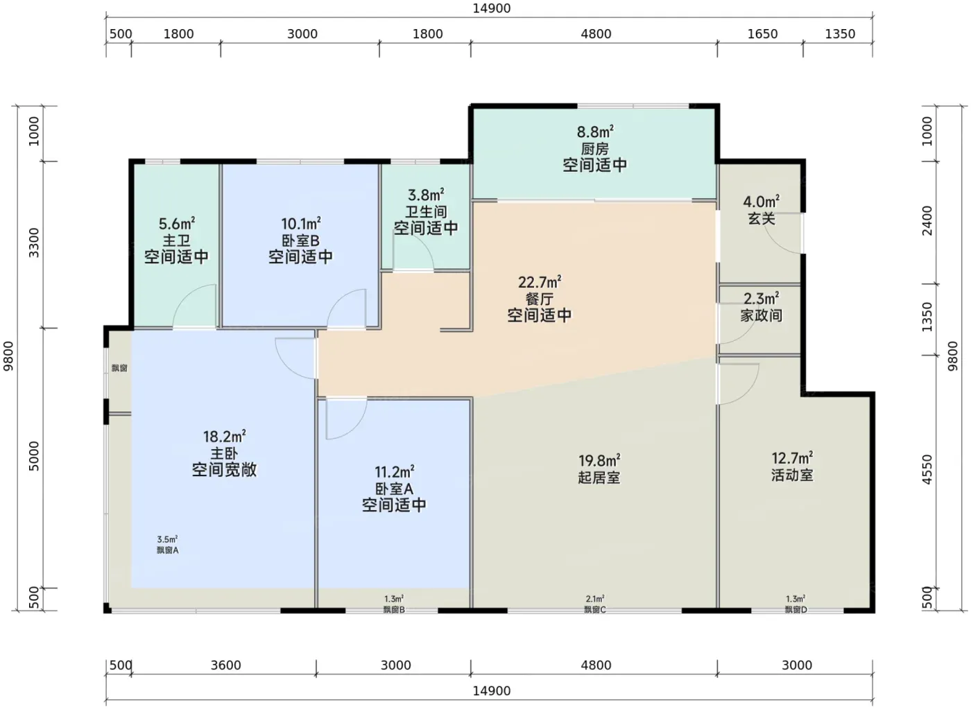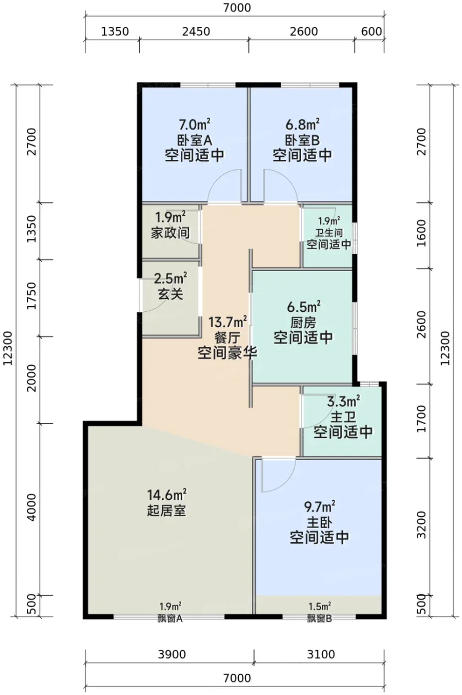 3️⃣得房率玄学:86㎡户型实得93㎡,飘窗设备平台白送7㎡,相当于买三居送小书房