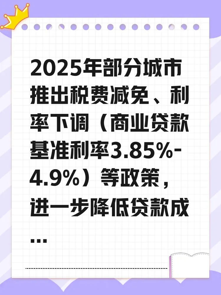 2025年部分城市推出税费减免、利率下调(商业贷款基准利率3.85%-4.9%)等政策,进一步降低贷款成本。