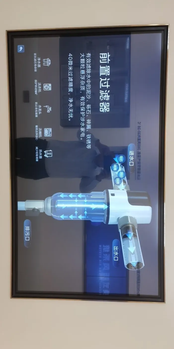 前置过滤系统初滤水中危害杂质,从源头上保证全家用水卫生,它通过符合食品接触材料国家标准(GB4806)的微米级不锈钢滤网和高品质PC材质滤瓶,有效拦截过滤水中的泥沙、铁锈、悬浮物、虫卵、大颗粒杂质和浑浊物等,为全家用水健康和后续用水设备起到第二层保护作用。前置系统通过计时、冲洗、内置稳压阀,有效保护因水压过高造成的机器损坏,加装单向阀,防止因热水倒灌造成的滤瓶或其他部件损坏。