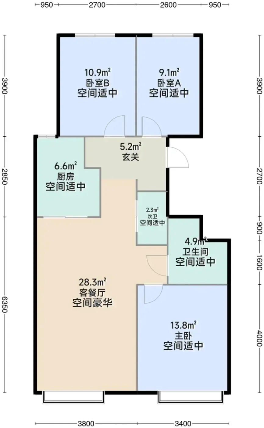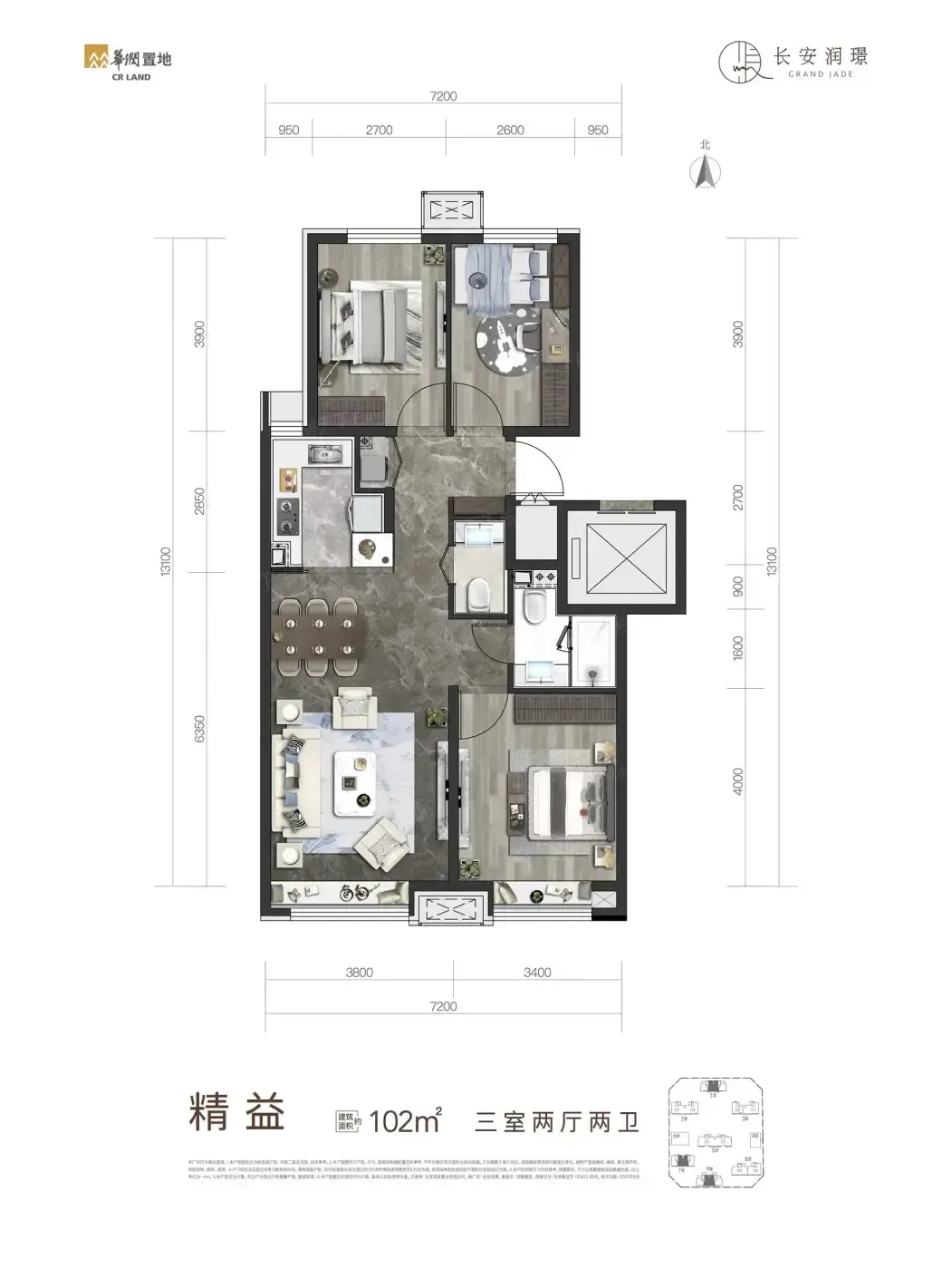 2️⃣ 102㎡做3居不稀奇,但客厅面宽4.2米还能保持双卫配置,实测摆放L型沙发后过道仍有余量