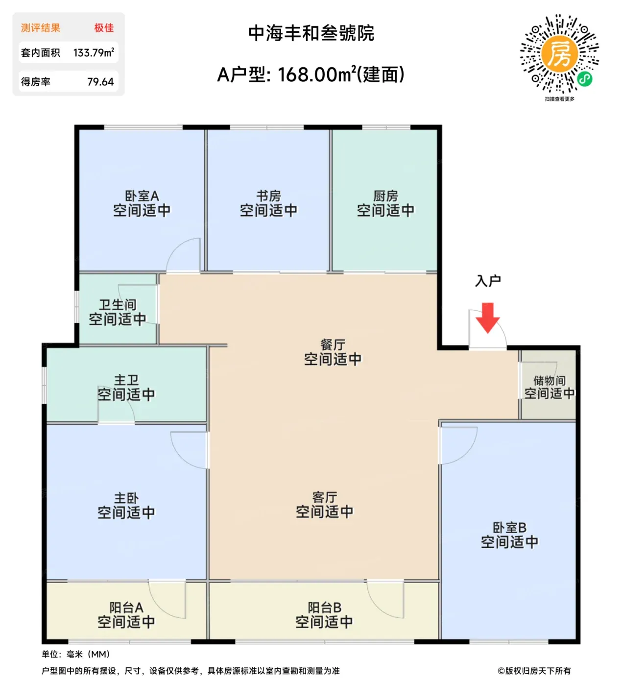 从生活容器角度看户型确实能打:168㎡四居室南北通透,全明格局让清晨阳光能流转三个卧室,家政间藏在玄关墙后,家庭动线相当能打。但得房率79%稍显拘谨,262㎡主卧套间虽然配了三分离卫浴,但玄关储物空间仅2.8米进深。