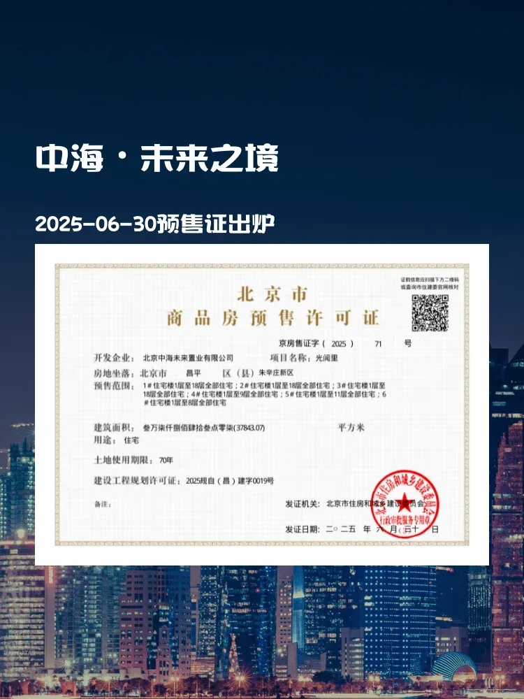 中海·未来之境6月30日正式获批预售证(京房售证字(2025)71号)🔥!1#-6#楼栋全部开售,回昌东路西侧核心位置,步行5分钟直达朱辛庄地铁站🚇,通勤党狂喜!