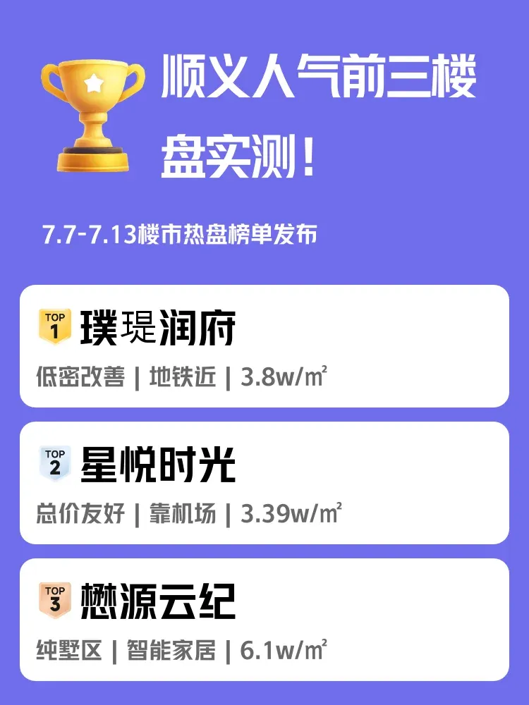 上周(7.7-7.13)顺义新房市场爆了🔥 商圈人气榜前三项目访问量集体破千,主打低密改善的璞瑅润府以1994分断层领先!每天挤早高峰3小时vs家门口地铁自由,刚需和改善该怎么选?