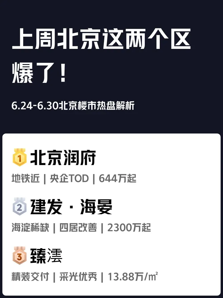 🔥上周(6.24-6.30)北京楼市实况:海淀&大兴购房热度飙升!那些每天通勤3小时的朋友,看到步行5分钟到地铁的楼盘真的不心动吗?这份人气榜前三深度扒皮收好!