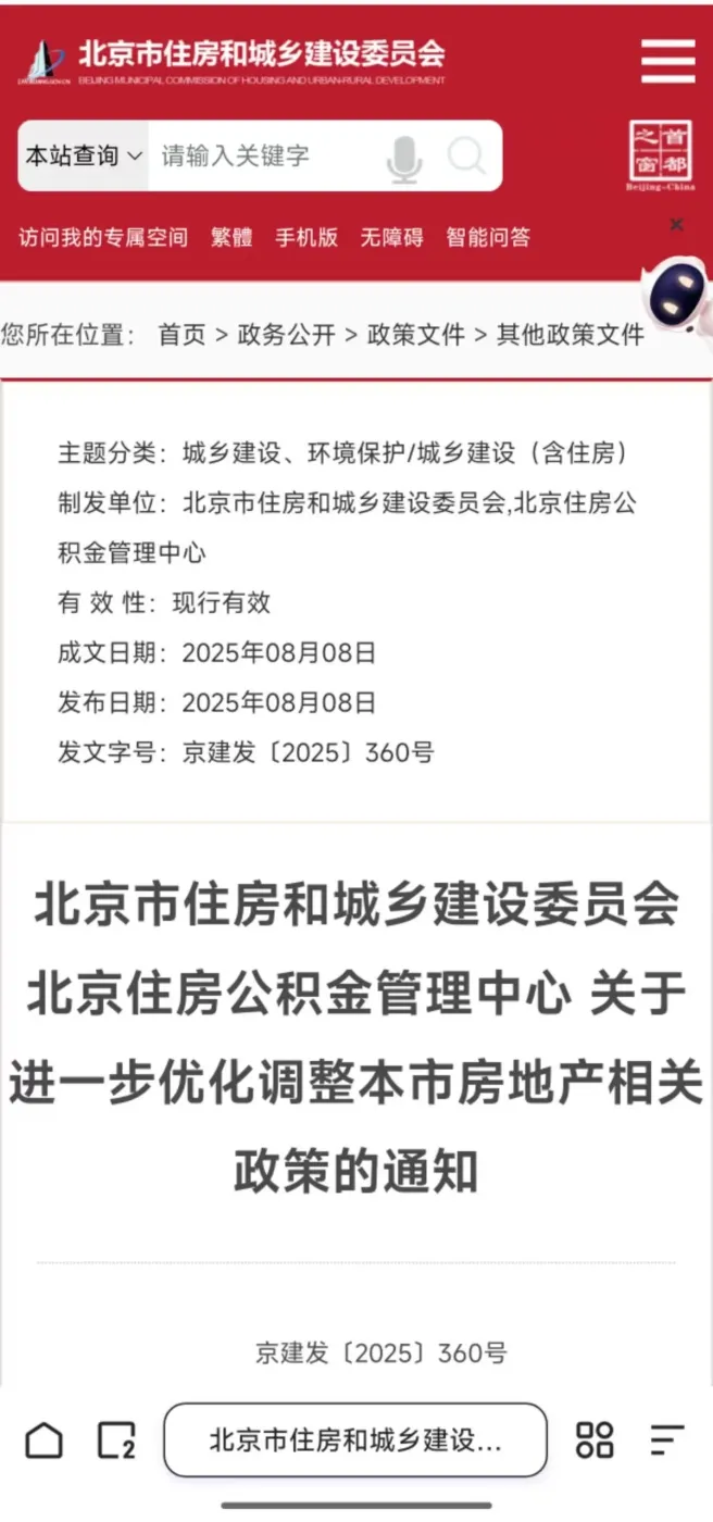 刚刚,北京市住房和城乡建设委员会、北京住房公积金管理中心联合印发《关于进一步优化调整本市房地产相关政策的通知》,《通知》明确,自2025年8月9日起,