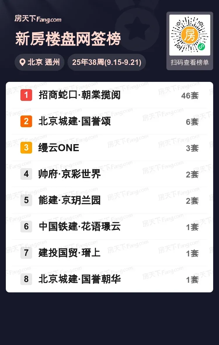 值得注意的是,第二名的北京城建·国誉颂仅签约6套,缦云ONE以3套位列第三梯队。超半数上榜项目成交量停留在1-2套,显示出当前购房者更倾向聚焦标杆项目。