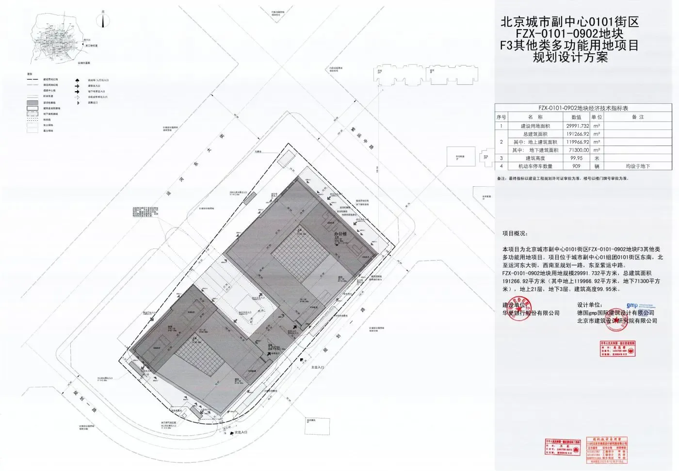 北京城市副中心0101街区FZX-0101-0902地块F3其他类多功能用地项目,北至运河东大街,西南至通州杨坨六街,东至紫运中路。项目总建设用地面积29991.732平方米,总建筑面积191266.92平方米,其中地上建筑面积119966.92 平方米,地下建筑面积71300.00平方米(最终指标以建设工程规划许可文件为准)。为维护社会公共利益,保护公民合法权益,遵循公开、公平、公正的原则,有关法律法规要求,现将该项目的规划设计方案进行公示。