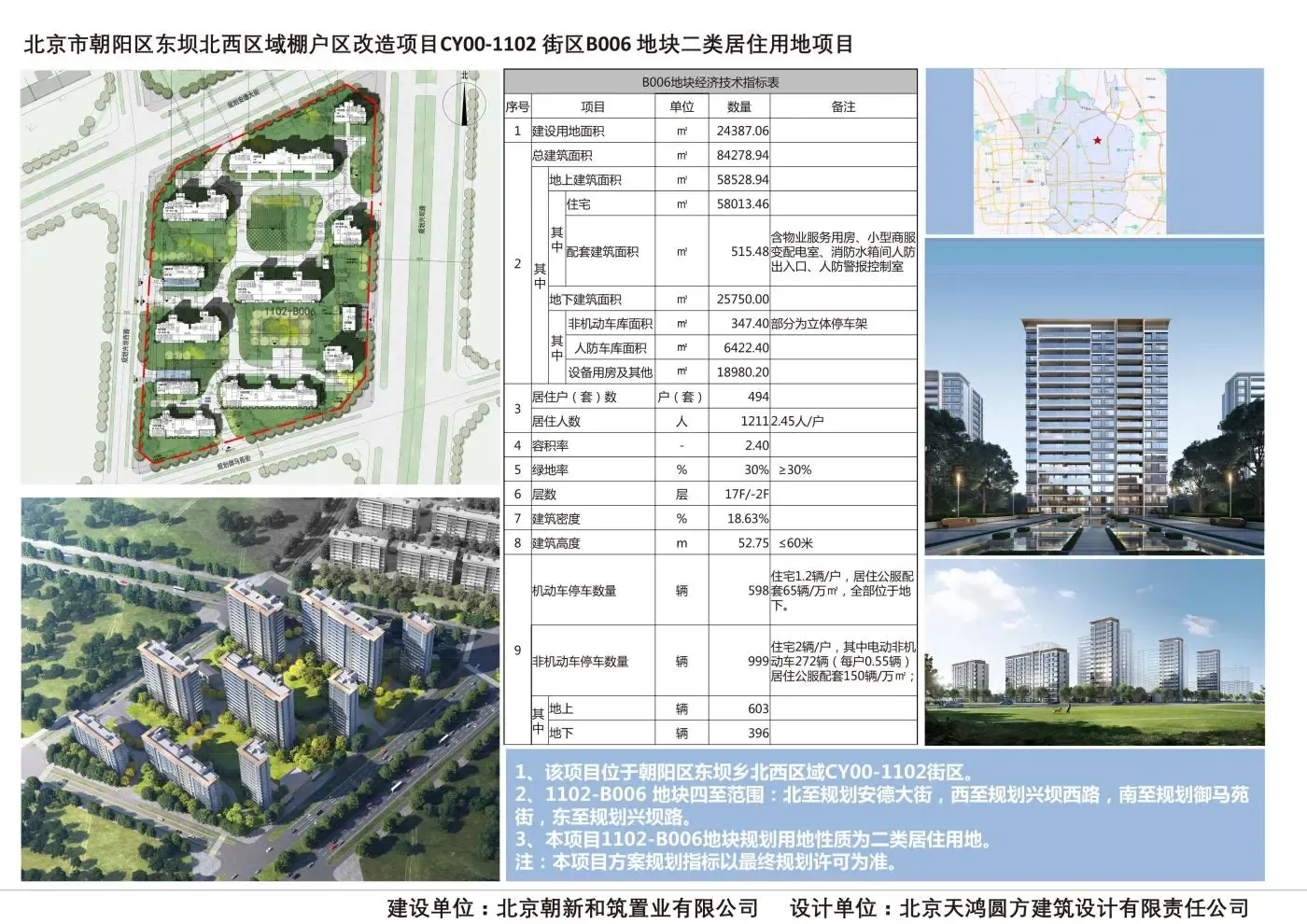 该项目位于朝阳区东坝乡北西区域CY00-1102街区B006地块,为我市2023年集中供地项目。保利(北京)房地产开发有限公司和北京京投置地房地产有限公司联合体(后变更名称为北京朝新和筑置业有限公司)取得该项目挂牌出让成交确认书、签订土地出让合同并委托北京天鸿圆方建筑设计有限责任公司进行了规划方案设计(具体方案和规划指标详见附图)。
