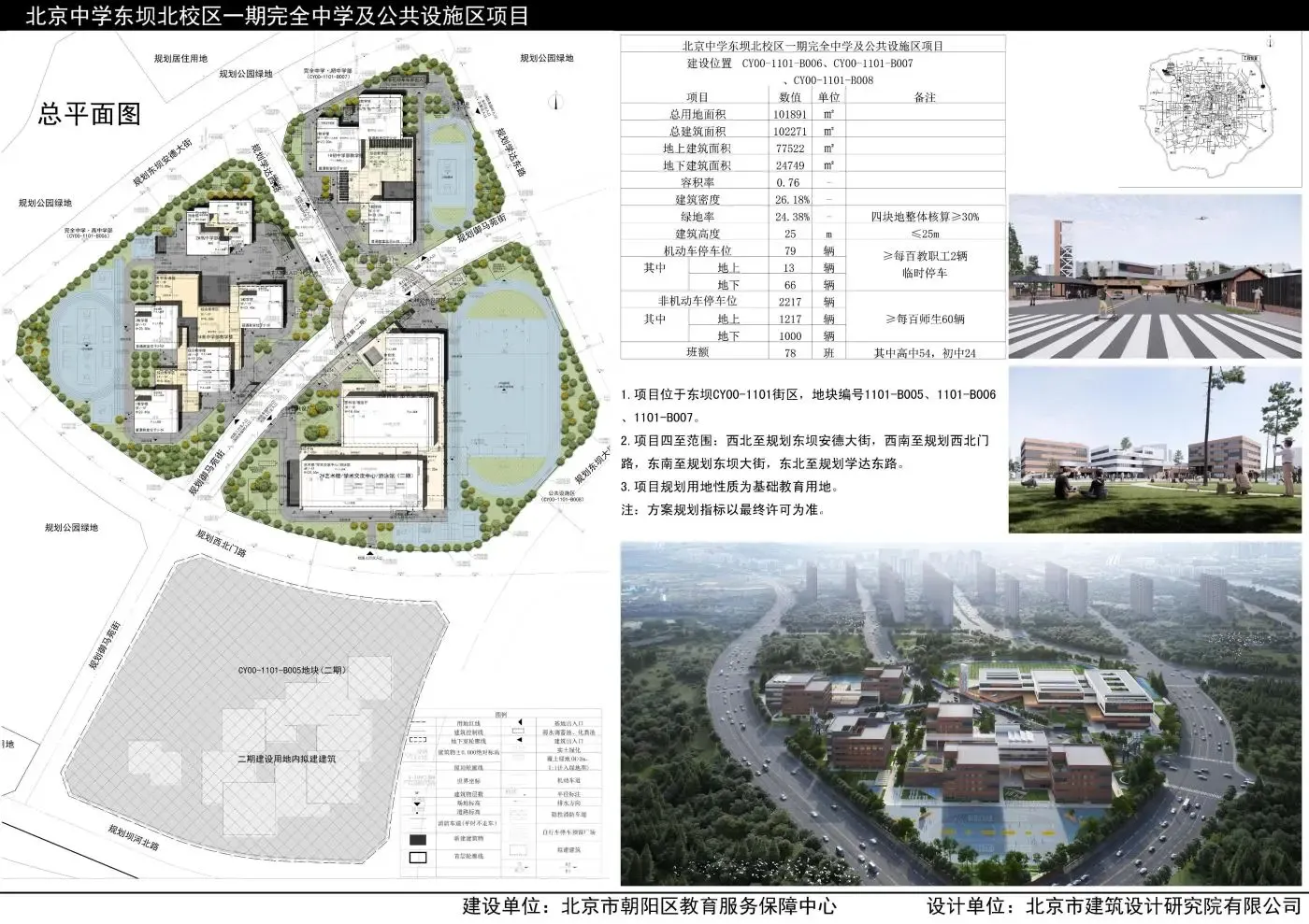 本项目位于东坝乡北西区域CY00-1101街区1101-B006、1101-B007、1101-B008地块,西北至规划东坝安德大街,西南至规划西北门路,东南至规划东坝大街,东北至规划学达东路。建设单位北京市朝阳区教育服务保障中心委托北京建筑设计研究院有限公司进行了规划方案设计(具体方案和规划指标详见附图)。