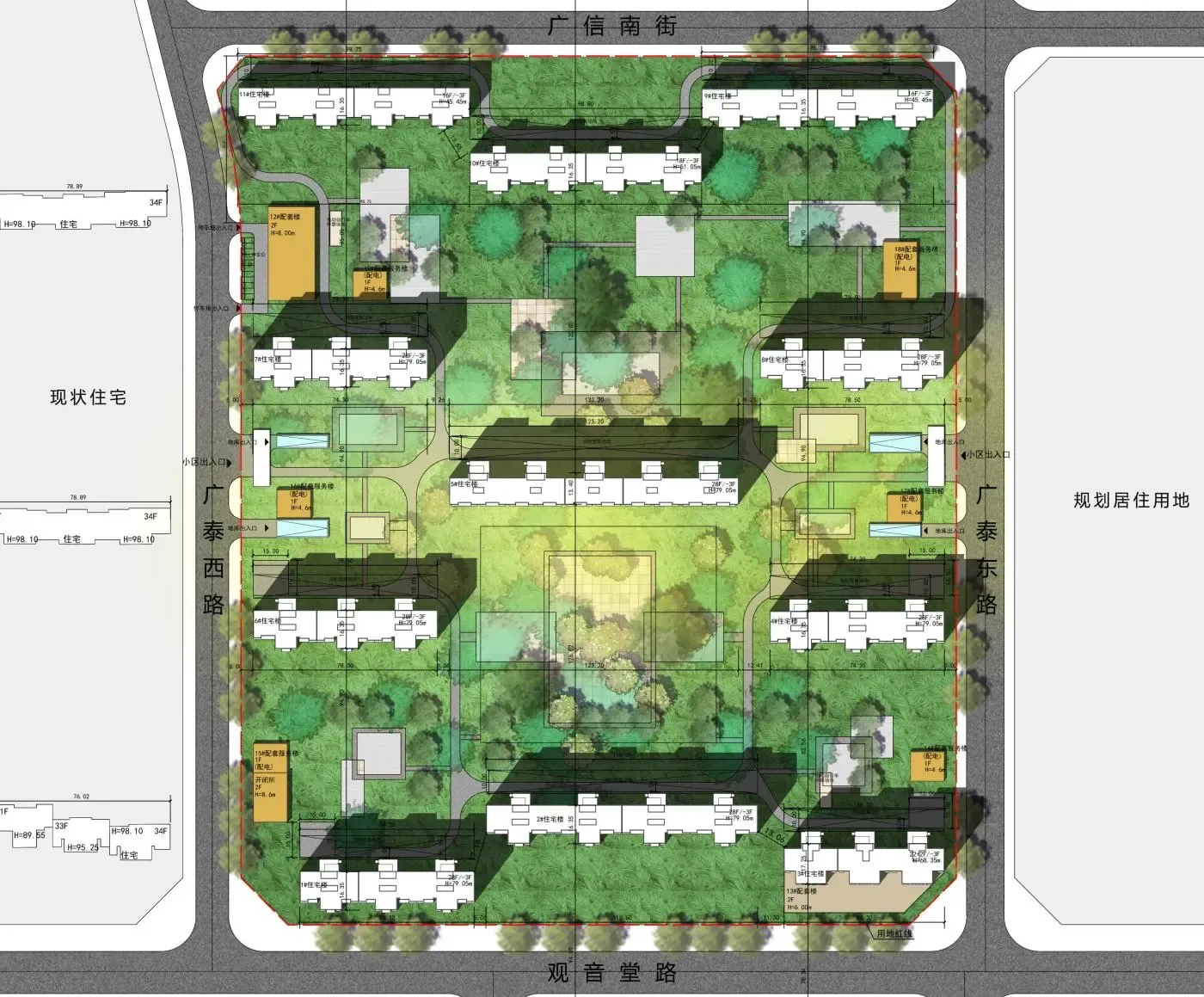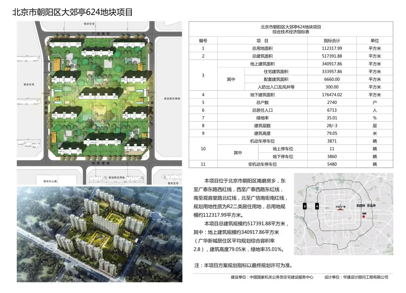 北京市朝阳区大郊亭624地块项目位于北京市朝阳区南磨房乡,东至广泰东路西红线,西至广泰西路东红线,南至观音堂路北红线,北至广信南街南红线,规划用地性质为R2二类居住用地。本项目总用地规模约112317.99平方米,总建筑规模约517391.88平方米,其中:地上建筑规模约340917.86平方米(广华新城居住区平均规划综合容积率2.8),建筑高度79.05米,绿地率35.01%。建设单位为中国国家机关公务员住宅建设服务中心。