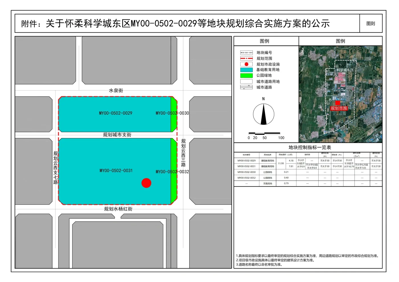 为落实密云分区规划及相应街区控规,加快推进怀柔科学城东区公共服务设施建设,《怀柔科学城东区MY00-0502-0029等地块规划综合实施方案》已编制完成,根据《北京市城乡规划条例》和《规划综合实施方案编制暂行办法》等相关规定,现对其主要内容进行公示,听取公众意见,公示期限30天。