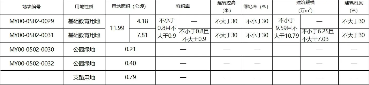 指标控制:基础教育用地容积率不小于0.8且不大于0.9,建筑密度不大于30%,绿地率不小于30%,建筑限高30米。