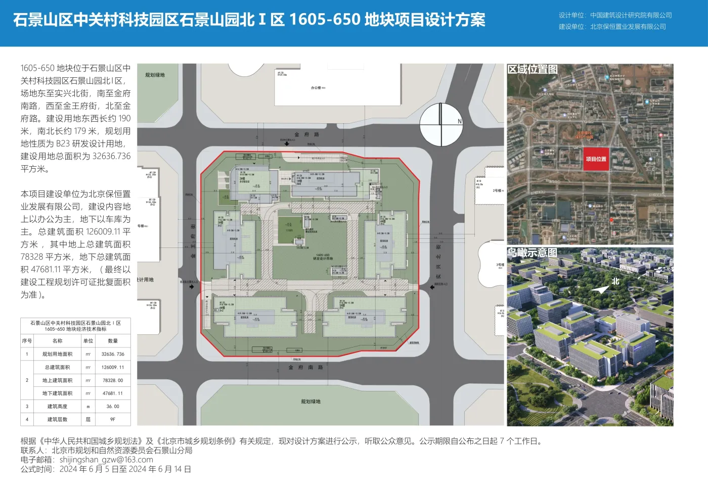 北京保恒置业发展有限公司委托中国建筑设计研究院有限公司对石景山区中关村科技园区石景山园北Ⅰ区1605-650地块项目进行规划方案设计(详见附图)。