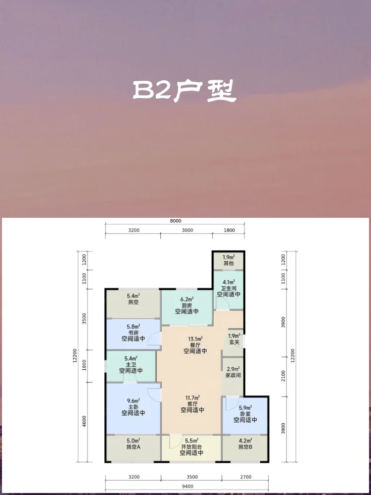 ◾️三代同堂方案:双南向卧室+北向老人房,4.8米横厅连接景观阳台,全家活动区超20㎡