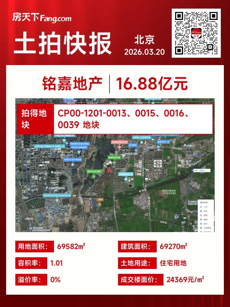 🏠 3月20日,北京迎来本周第三场涉宅用地土拍,本场仅一宗昌平区南邵板块涉宅用地,最终铭嘉地产以16.88亿元斩获地块。