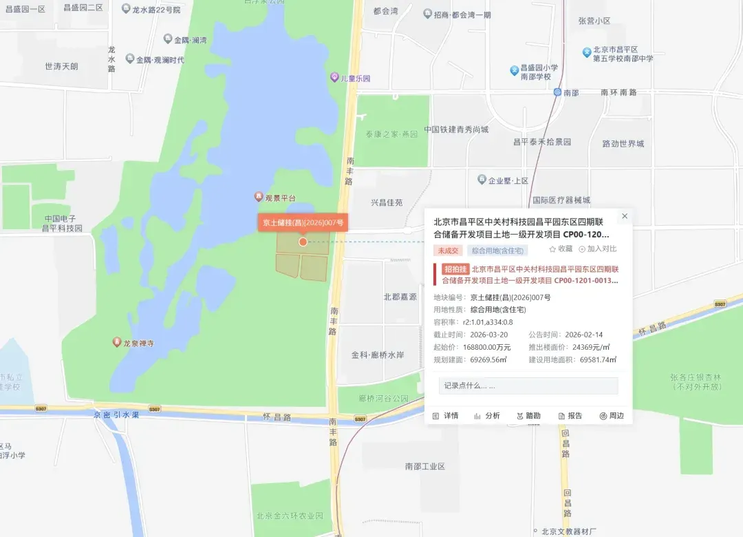 📊 中关村科技园昌平园东区四期联合储备开发项目土地一级开发项目 CP00-1201-0013、0015、0016、0039 地块,编号京土储挂(昌)[2026]007号,土地出让面积69581.74㎡,规划建筑面积69269.56㎡,起始价16.88亿元,住宅部分容积率为1.01,幼儿园部分容积率0.8。