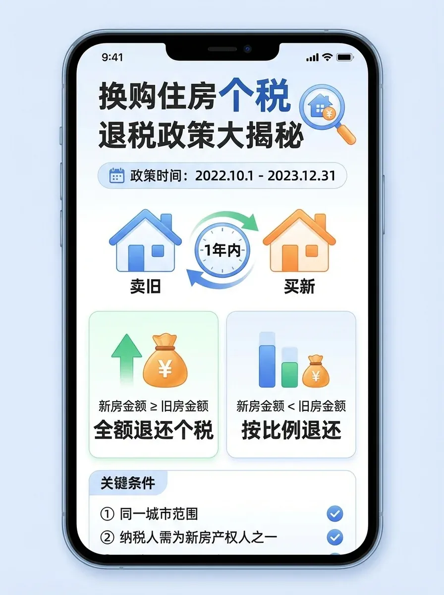 换购住房个人所得税退税政策是有明确规定的。自2022年10月1日至2023年12月31日,对出售自有住房并在现住房出售后1年内在市场重新购买住房的纳税人,给予退税优惠。