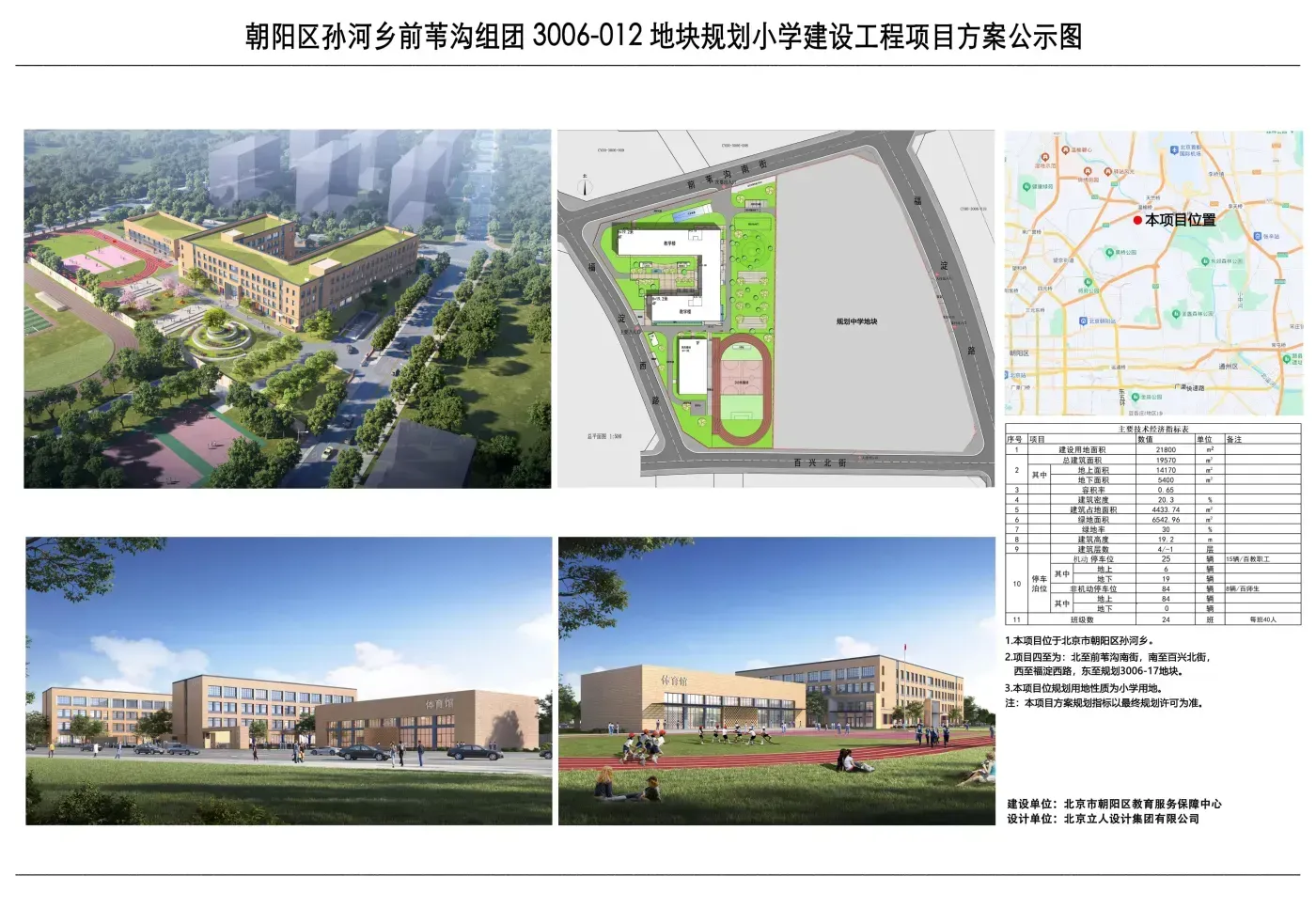 朝阳区孙河乡前苇沟组团 3006-012地块规划小学建设工程项目位于孙河乡。项目四至为:北至前苇沟南街,东至3006-017地块,南至百兴北街,西至福淀西路。建设单位为北京市朝阳区教育服务保障中心,现委托北京立人设计集团有限公司进行了规划方案设计(具体方案和规划指标详见附图)。