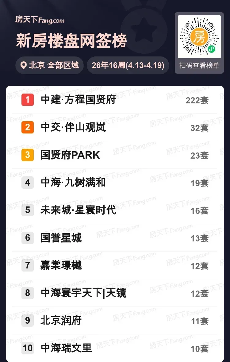 北京楼市的火热秘密藏在哪里?上周网签数据刚刚揭晓,中建·方程国贤府以222套的成交套数,成为市场瞩目的亮点!这个位于丰台的楼盘,价格52000元/平方米,吸引了众多购房者的目光。