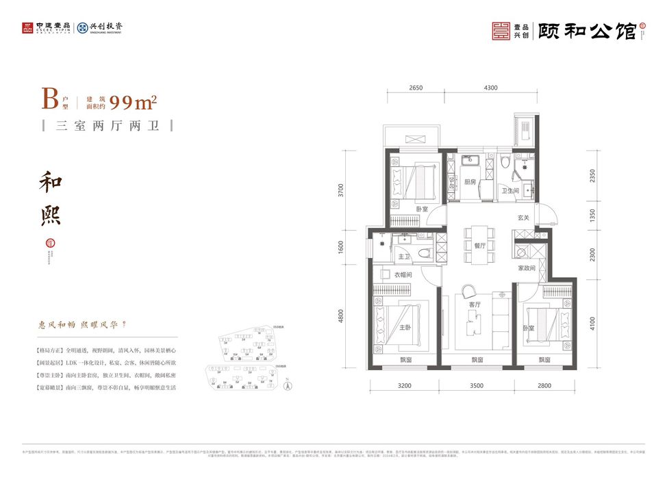 南向三面宽设计,市场上同面积段产品一般都是南向两个面宽;我们的98户型南向采光面宽达9.5米,双卧朝南;南向设有主卧套房,面宽约3.2米,进深约4.8米,独立卫生间、衣帽间,舒适度私密性兼具;南向次卧面宽2.8米,进深41米,南自次卧设计也是极大提升了我们家人的幸福指数。室内动静分区各居室空间独立互不干扰,是典型的眼镜户型,大大保护业主居住的私密性。南向客厅面宽3.5米,与餐厅、厨房为一道纵轴。