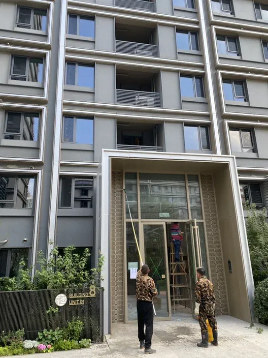 交付前夕,楼栋外观保洁进行中