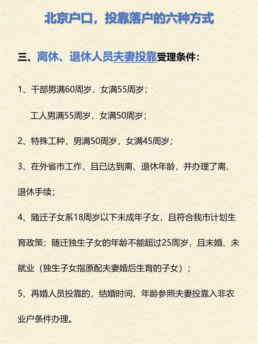 ✅三、离休、退休人员夫妻投靠: