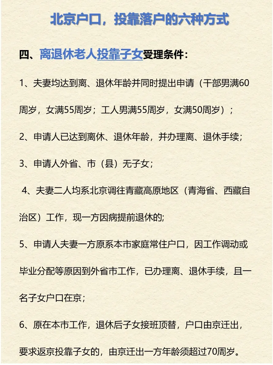 6、原在本市工作,退休后子女接班顶替,户口由京迁出,要求返京投靠子女的,由京迁出一方年龄须超过70周岁。