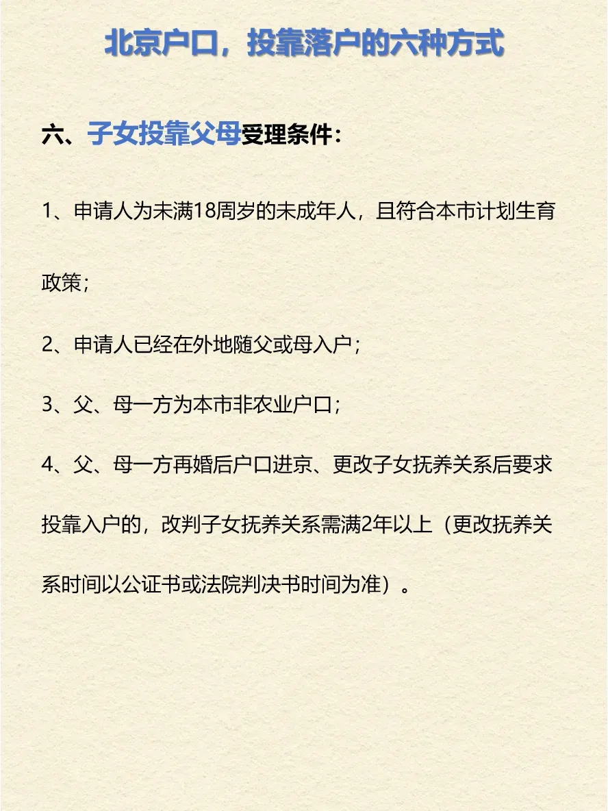4、父、母一方再婚后户口进京、更改子女抚养关系后要求投靠入户的,改判子女抚养关系需满2年以上(更改抚养关系时间以公证书或法院判决书时间为准)。