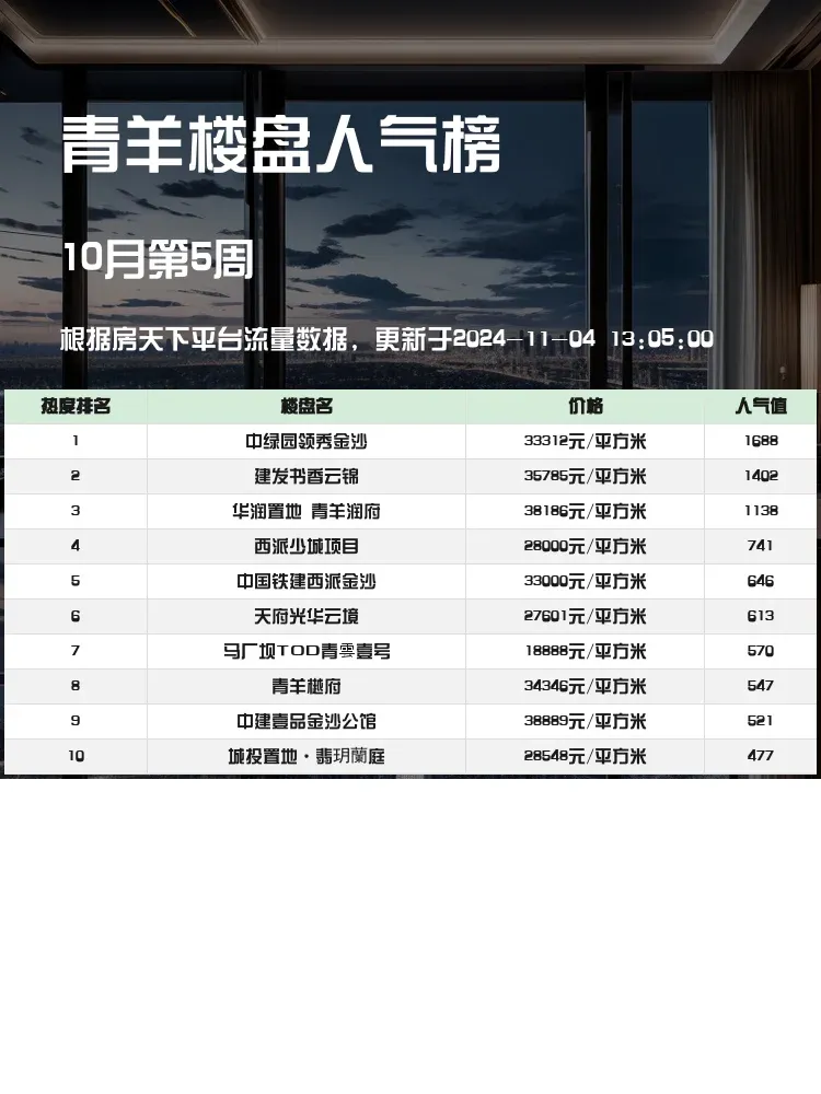 🏠 在房产市场上,选房的核心逻辑是找到适合自己需求的完美住所,而人气楼盘榜单正是购房者的重要参考。它不仅反映了市场热度,还为购房者提供了有关地理位置、交通、教育等多方面的实用信息。下面就让我们来看看青羊区那些备受青睐的人气楼盘吧。