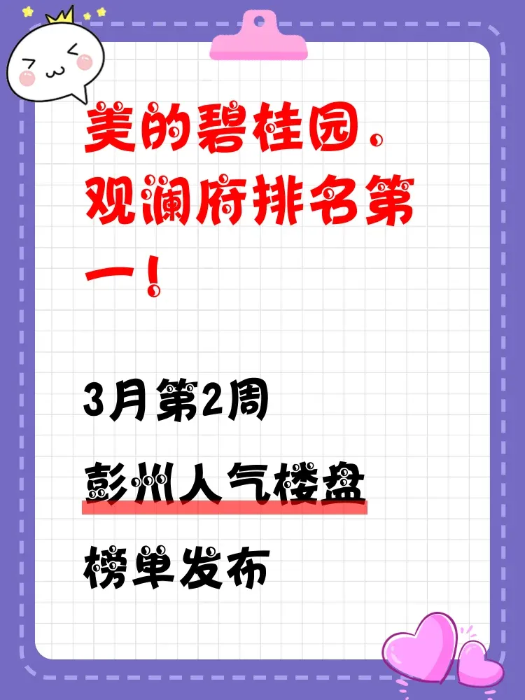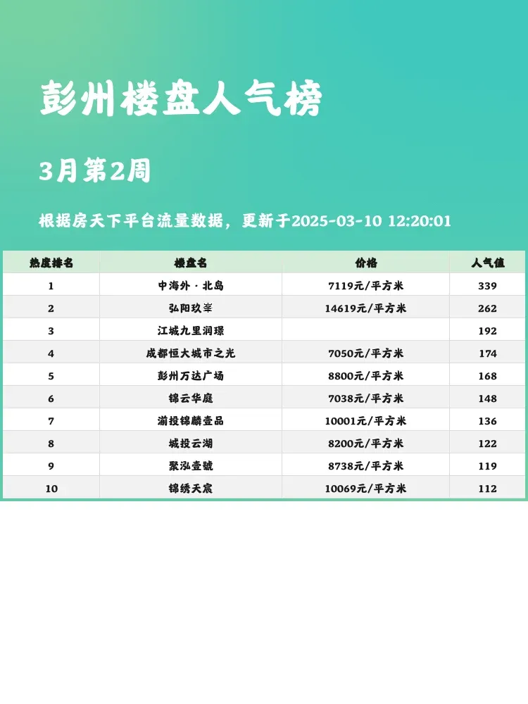 在彭州买房,选对楼盘是关键!当前市场,购房者更注重性价比、地段和未来发展潜力。这份人气楼盘榜单,帮你快速锁定优质房源,避免踩坑,轻松找到心仪的家!
