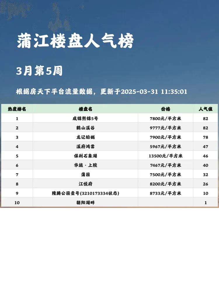 买房选盘看榜单准没错!🏆 人气楼盘榜单直接反映市场真实热度,跟着买不容易踩雷💣 当前市场下,既要关注价格优势💰,也要看户型实用性和配套成熟度🏫 这份蒲江最新榜单,帮你快速锁定高性价比好盘~