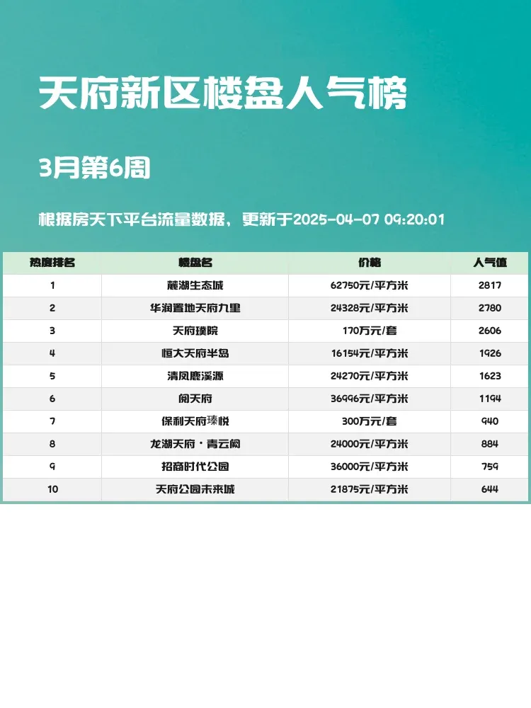 买房选对区域很重要,但同区域内楼盘差异也不小!这份天府新区人气榜单帮你快速锁定优质盘✨当前市场下,配套成熟度+产品稀缺性+价格优势才是选房黄金三角,这份榜单正好覆盖了这些关键维度~