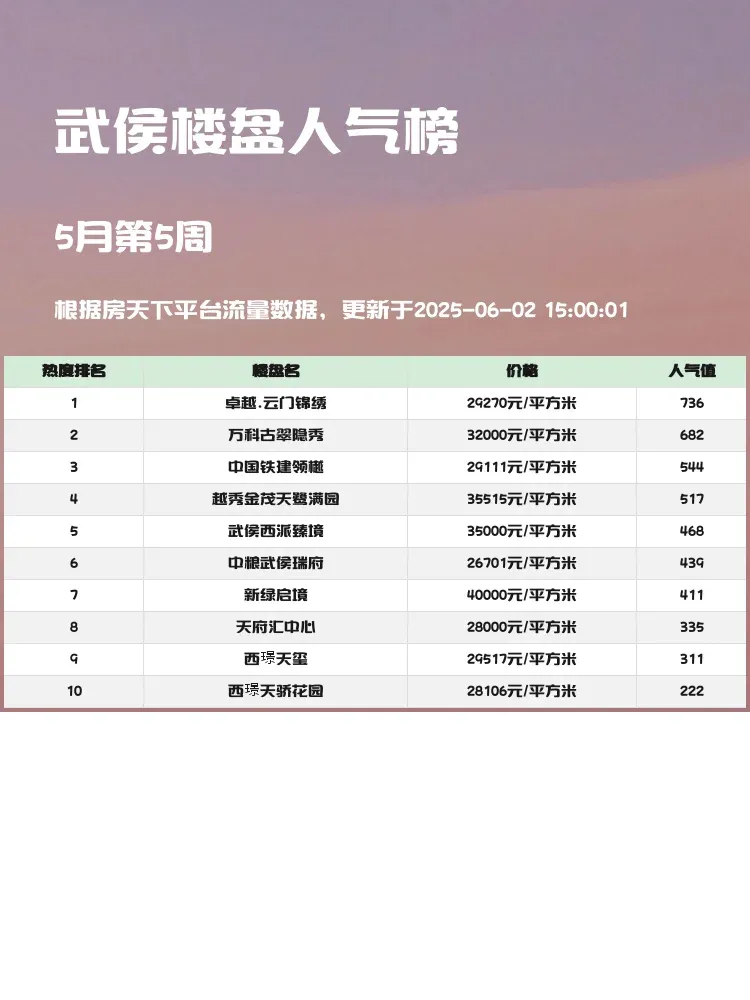 买房选房看榜单准没错!🏆 人气楼盘榜单能直观反映市场热度,跟着买不容易踩雷~当前市场核心逻辑就是"地段+配套+品质"三要素缺一不可!今天就带大家扒一扒武侯区近期最火的3个神盘,优缺点全解析👇