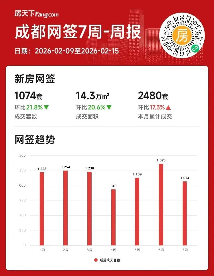 📉刚过去的2月第二周(2.9-2.15),成都新房成交1074套,环比下降21.8%!成交面积也缩减至14.3万㎡,相当于每天少卖43套房。不过整个二月累计成交已达2480套,反而比上月同期多出366套,环比增长17.3%✨