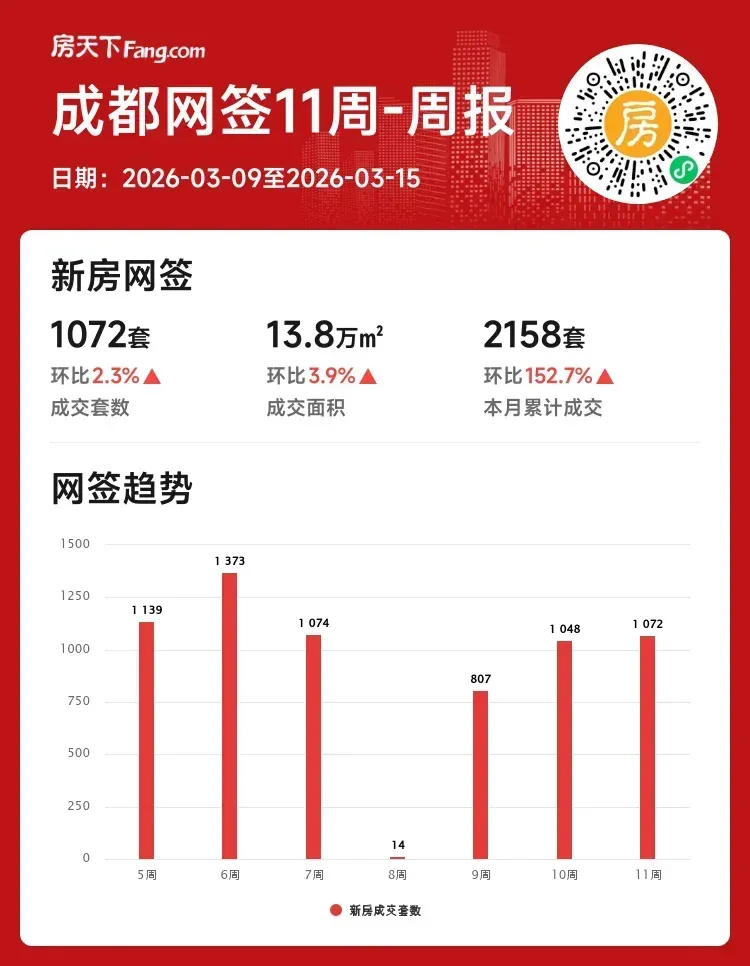 🚀春雷炸响楼市暖!3月9日-15日成都新房成交1072套,环比微涨2.3%,本月累计2158套的成交数据更创下152.7%的惊人涨幅,小阳春行情持续发力!