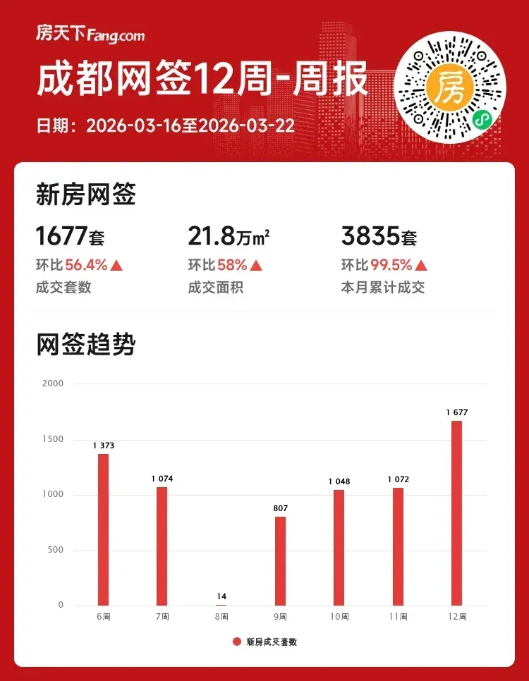 🚨成都买房人注意!3月16日-22日这一周,新房市场突然发力,成交1677套创下本月新高,较前周激增605套!建筑面积成交21.8万㎡环比上涨58%,楼市小阳春提前到来?