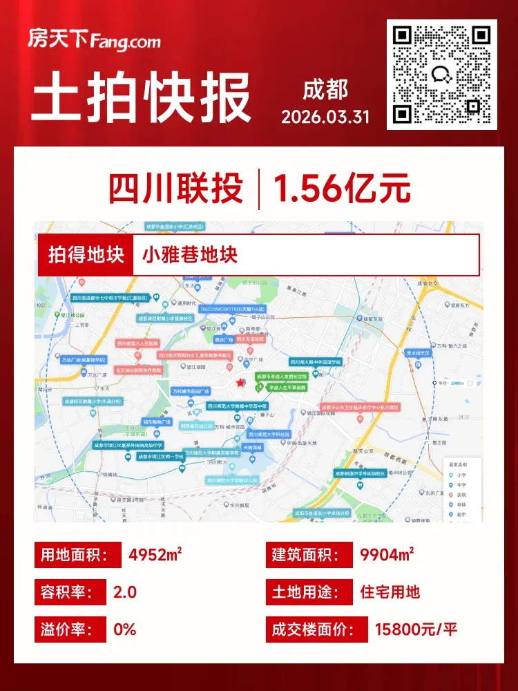 🎯 最终四川联投以楼面价15800元/㎡竞得该地块,成交总价1.56亿元,溢价率0%。