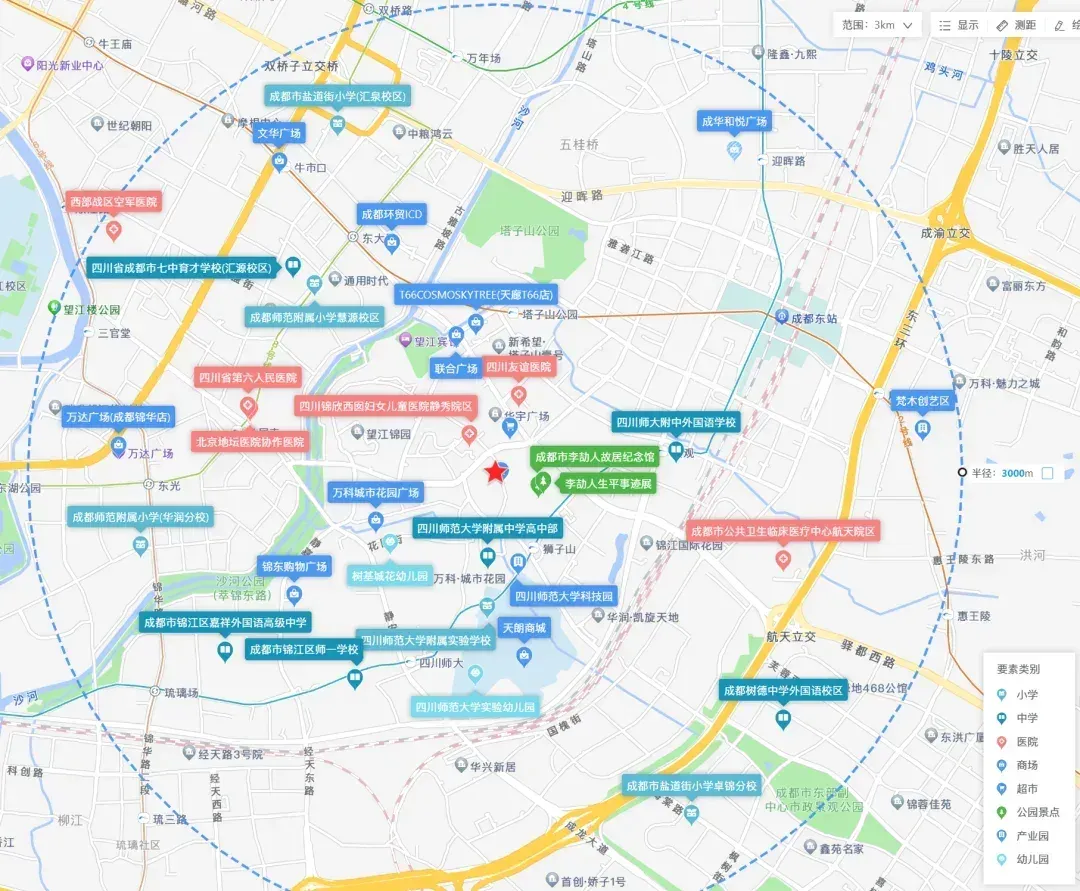 📚 教育配套完善,地块3km范围内聚集了一级小学四川师范大学附属实验学校。