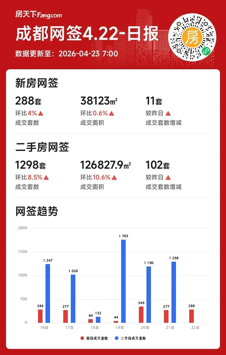 成交套数:288套 ↑4%(较昨日增11套)