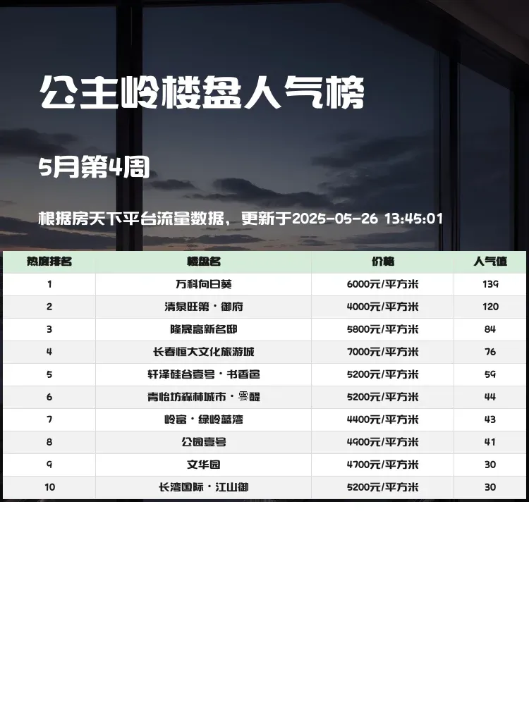 买房选房看人气准没错!🏡 人气楼盘榜单能直观反映市场真实热度,跟着榜单选房省时又省力~当前市场环境下,性价比和配套成熟度成为购房者最关注的因素,这份公主岭最新人气楼盘TOP3榜单,帮你快速锁定优质房源!✨