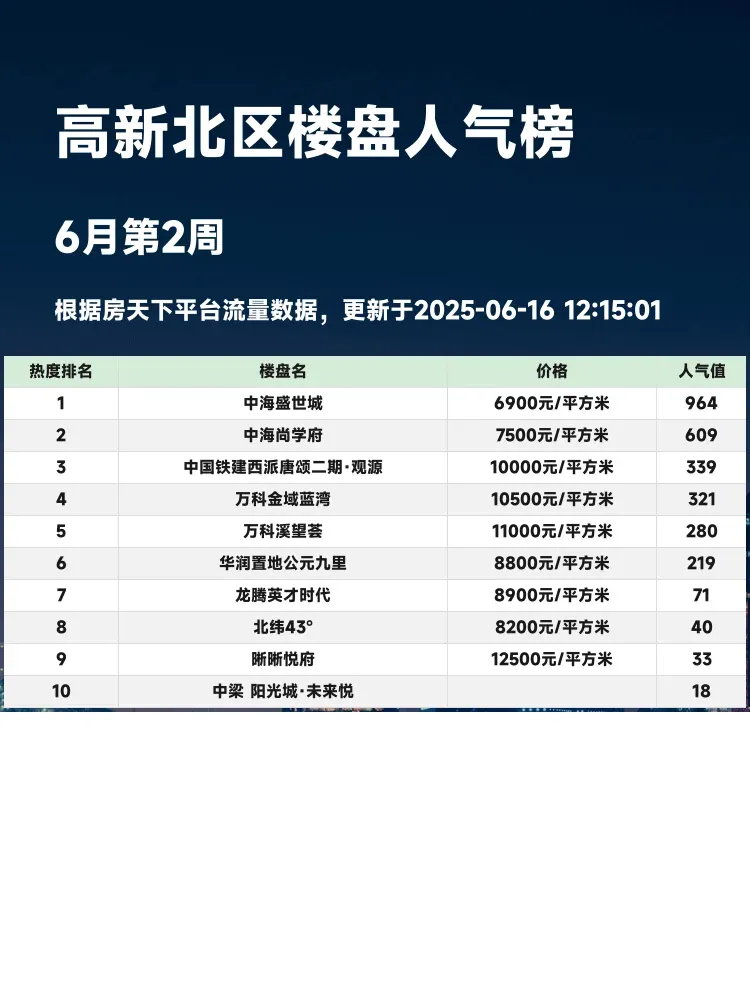 买房选对区域等于成功一半!🏆这份高新北区人气楼盘榜单,综合了交通、教育、户型等硬指标,帮你避开选择困难症~当前市场下,既要关注单价优势,更要看准配套成熟度,毕竟住的舒心比啥都重要!💯