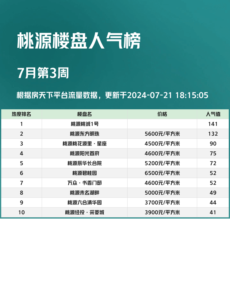 🏠在如今的房地产市场中,关注人气楼盘榜单至关重要,它不仅能帮助我们了解当前的市场热度,还能提供实际的购房参考。有了这些数据,买房选房将变得更加科学合理,避免盲目跟风。接下来,就让我们一起来看看桃源地区的人气楼盘榜单吧!