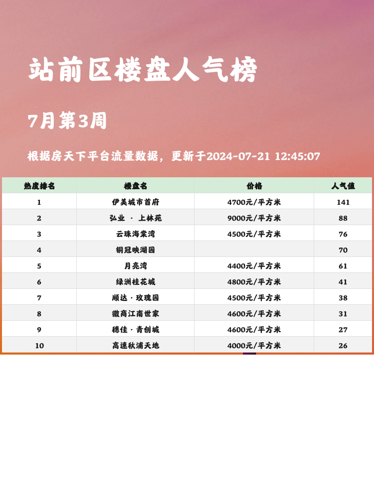 🏡 在当前购房市场中,选择一个人气楼盘对于购房者来说至关重要!📈 热门楼盘不仅意味着优越的地理位置和完善的配套设施,还代表着更高的升值潜力和更好的居住体验。今天给大家带来站前区热度最高的三个楼盘,帮助你找到心仪的家园!