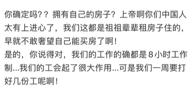 他们觉得中国的买房人特别上进,他们大部分都不敢奢望买房子,赚的钱只够租房子住。(图6)
