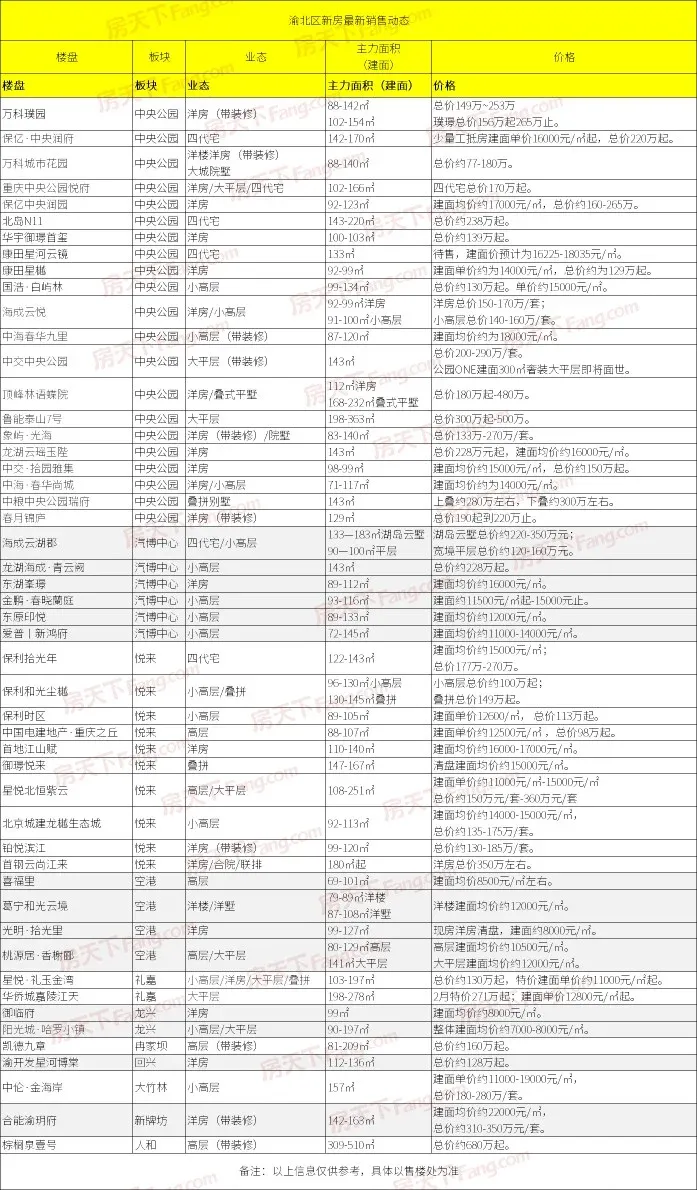 今天我们就给大家带来渝北区内所有新盘的最新价格信息(部分楼盘售楼处一直无法联系,所以未纳入表格)