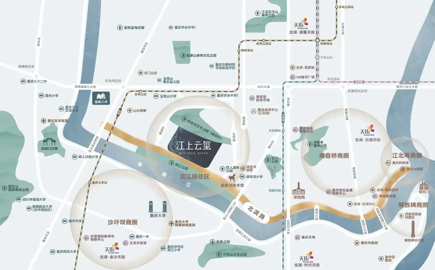 3️⃣北滨路黄金位:步行15分钟到玉带山站,实测到观音桥商圈开车12分钟