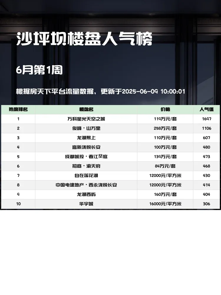 买房选对区域很重要‼️沙坪坝作为重庆教育资源最丰富的区域之一,一直是购房者关注的热点🔥这份人气楼盘榜单根据市场热度、配套资源和户型设计综合评选,帮你快速锁定优质房源🏡当前市场下,兼顾学区、交通和居住舒适度的楼盘才是明智之选💯